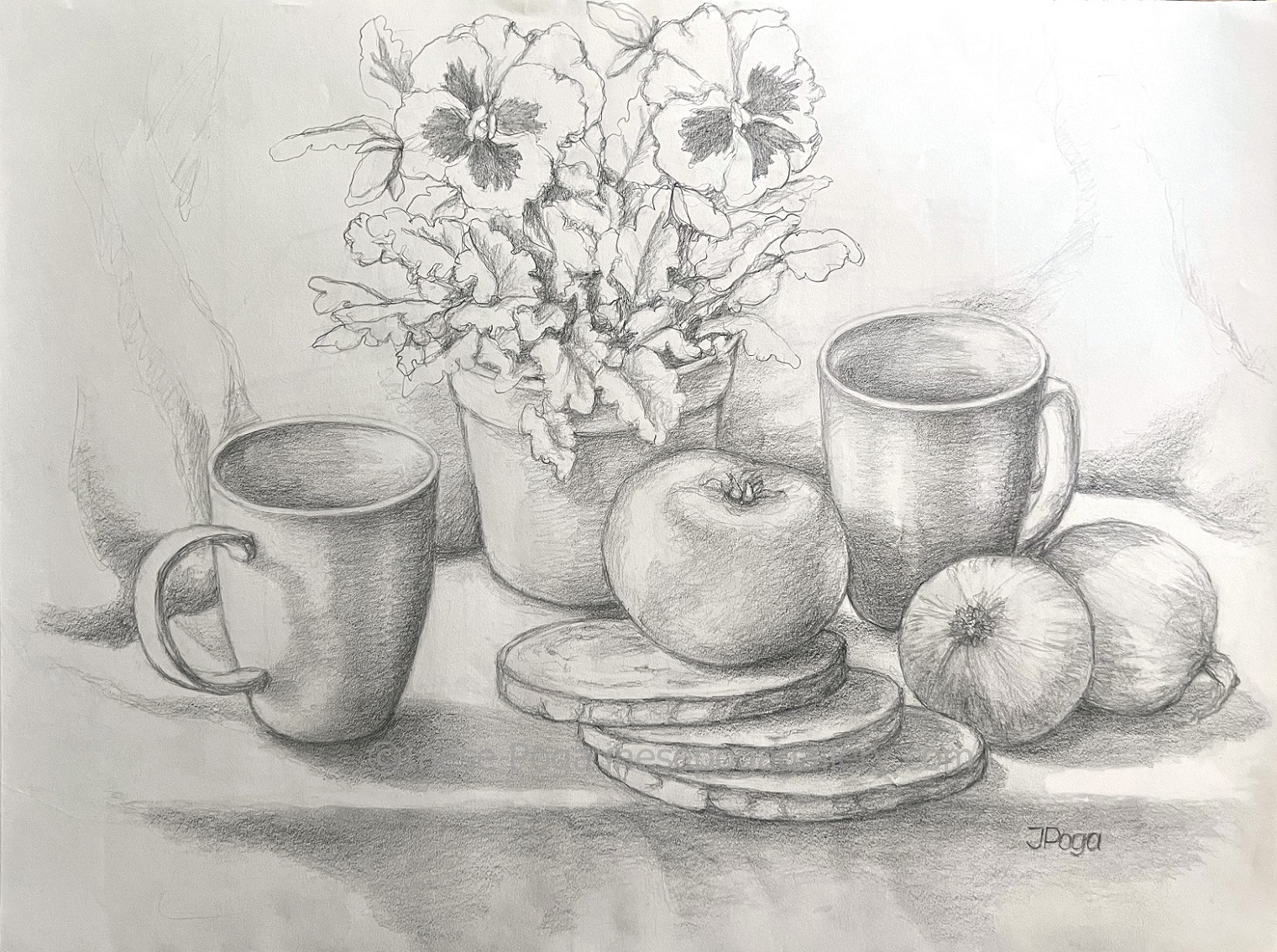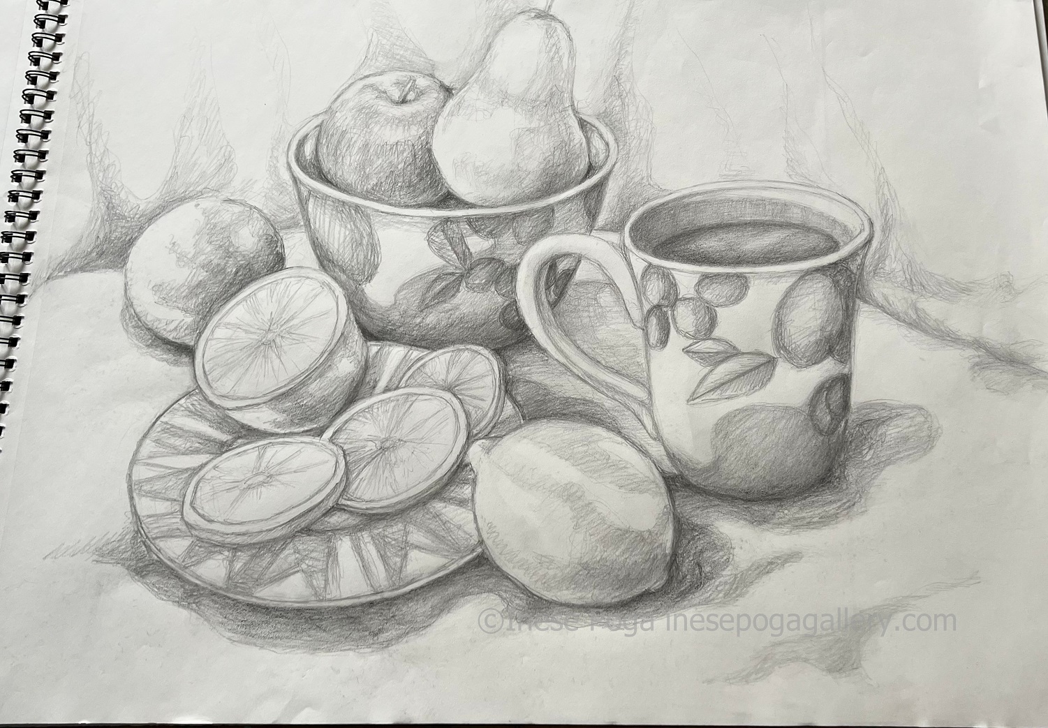 Observational drawing is my strength since I come from background where no photos and cameras were available or used. Therefore, I draw absolutely effortlessly and pretty much anything. I prefer setting up real things because that’s the best way to draw for me. No need for any devices or cameras. My drawings are large, most often 24 x 18 inches or 61 x 46 cm.