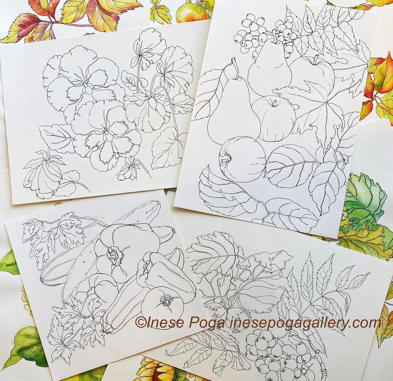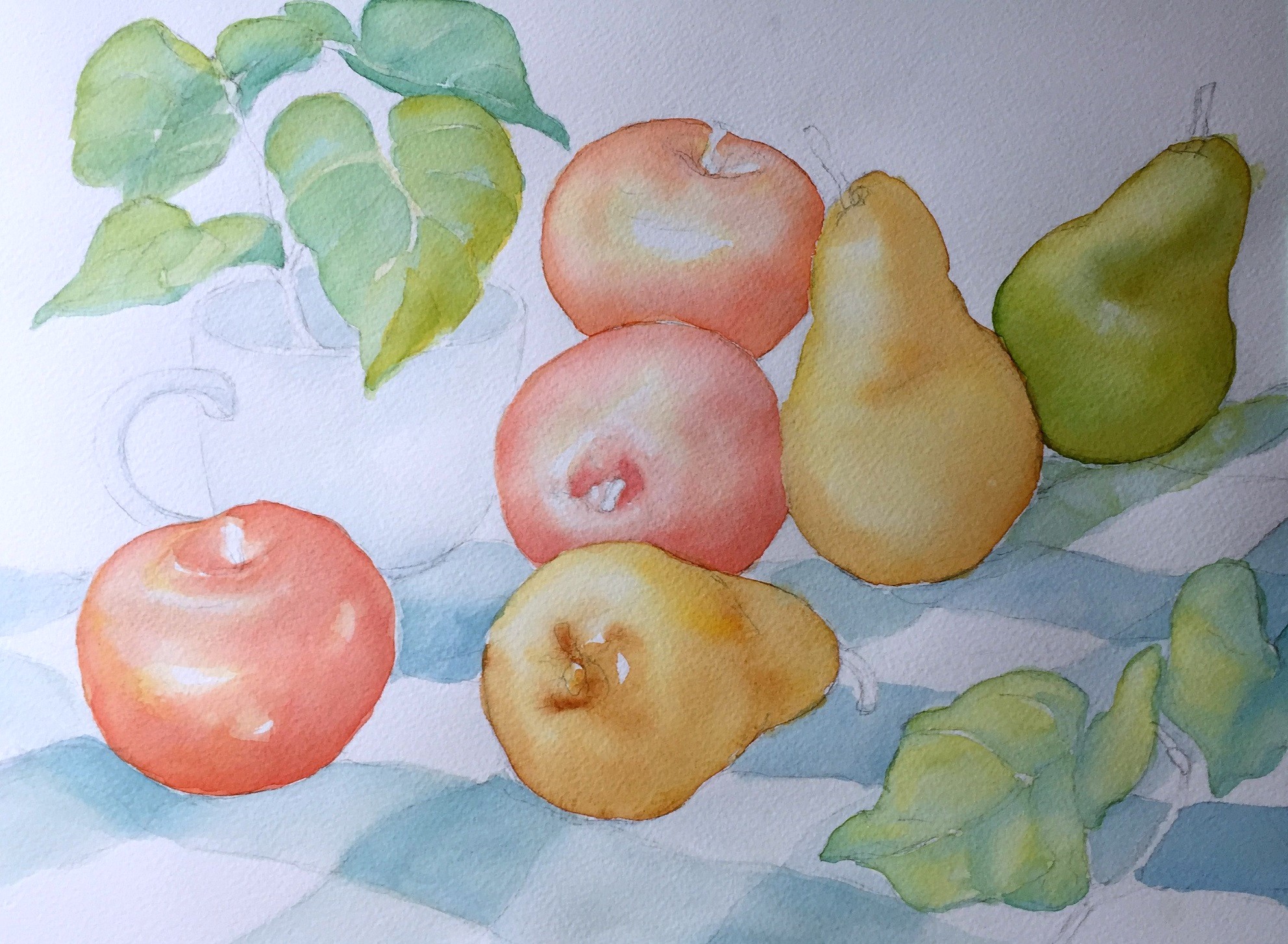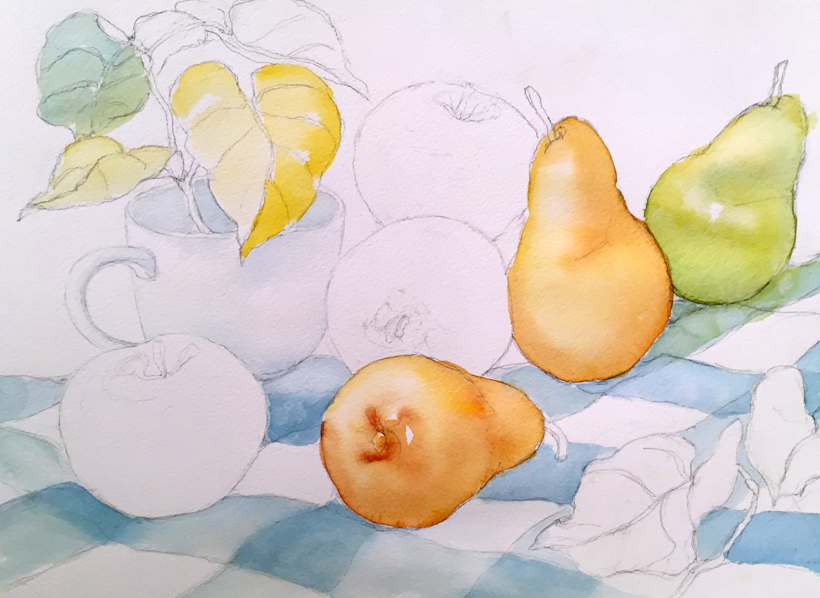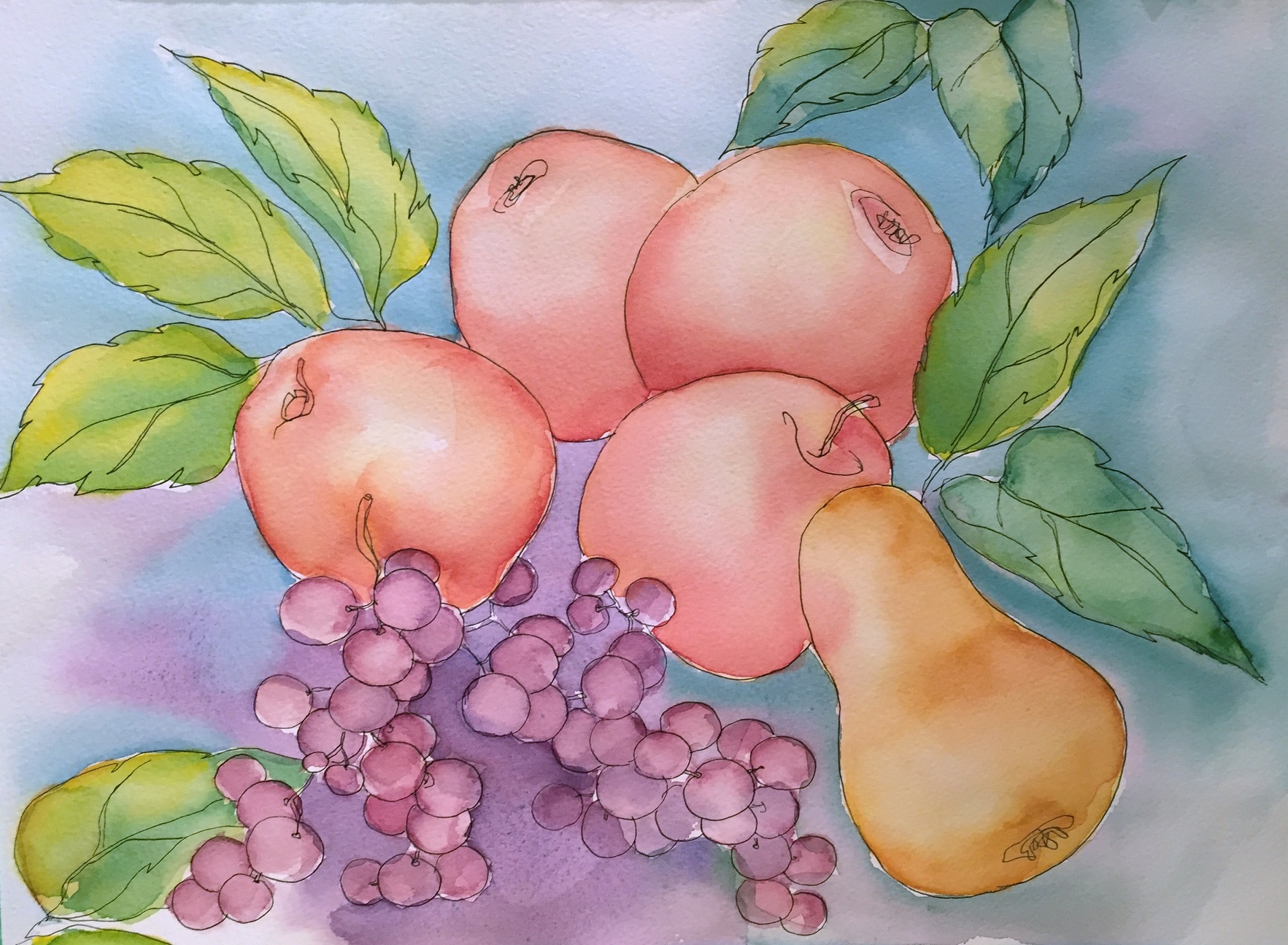 Drawing and watercolor painting take time, and I was recently short of it. However, we created sketches from real fruits in our watercolor class. We did also a large-scale reference drawing for our still life painting, and we are about to finish the chickadees and birch painting in the evening class. Creating pencil sketches is the best you can do to make painting easier.